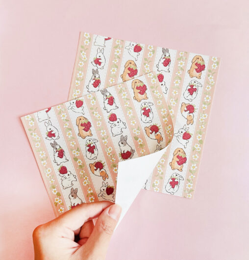 いちごと戯れるうさぎたちの絵で折り紙サイズのデザインペー…
